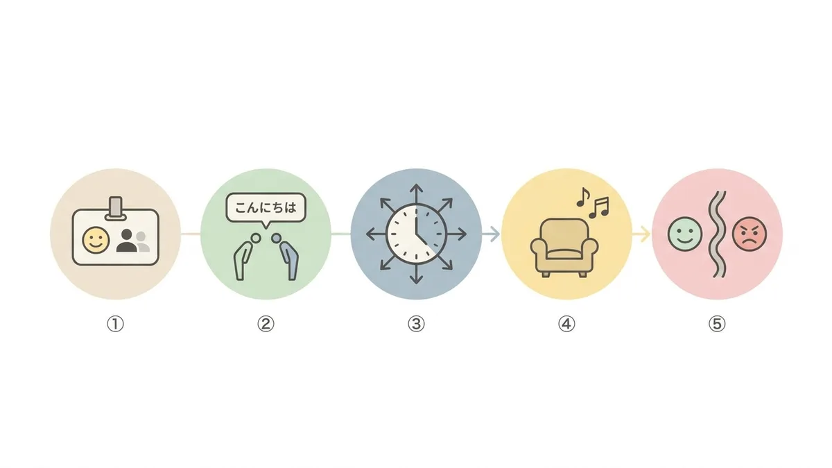 お客様自身の性格は店側では変えられませんが、「どんなお客様に来てもらうか」「どう振る舞ってもらうか」は店舗設計で誘導できます。具体例は以下 5 点: