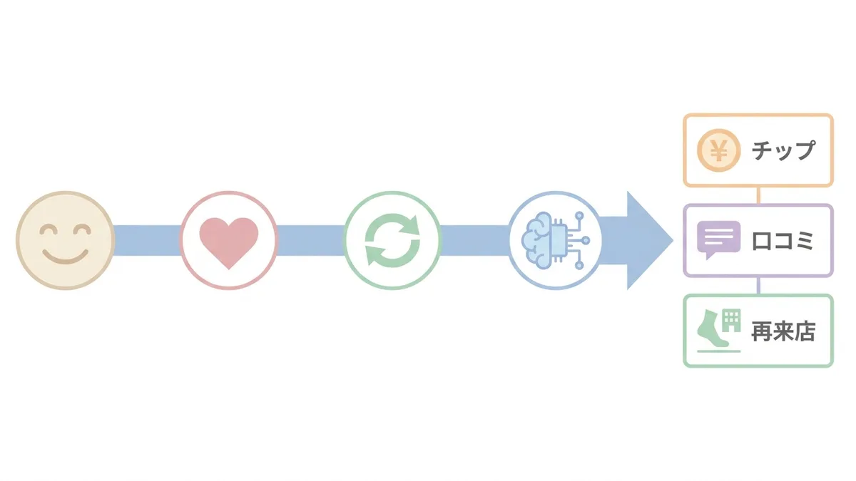 共通するのは「感情の伝染」です。接客者の前向きな表情は、顧客の感情状態を引き上げます。顧客が良い気分のまま会計を終えると、①その瞬間にチップを多めに置く、②外に出て誰かに話したくなる(口コミ)、③「また来たい」と記憶に刻まれる ── この 3 経路が同時に駆動します。