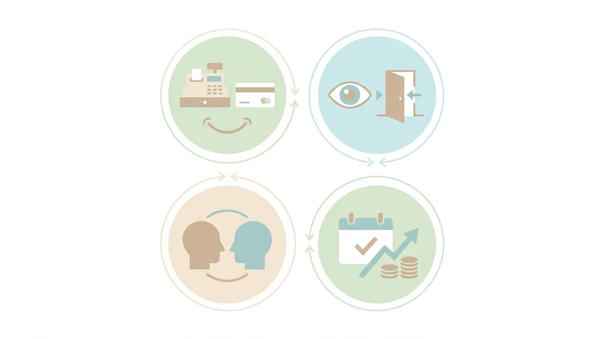 - 実践は 4 点に絞る: 会計時の笑顔、入退店時の目線、スタッフ間の雰囲気、月次のリピート率測定